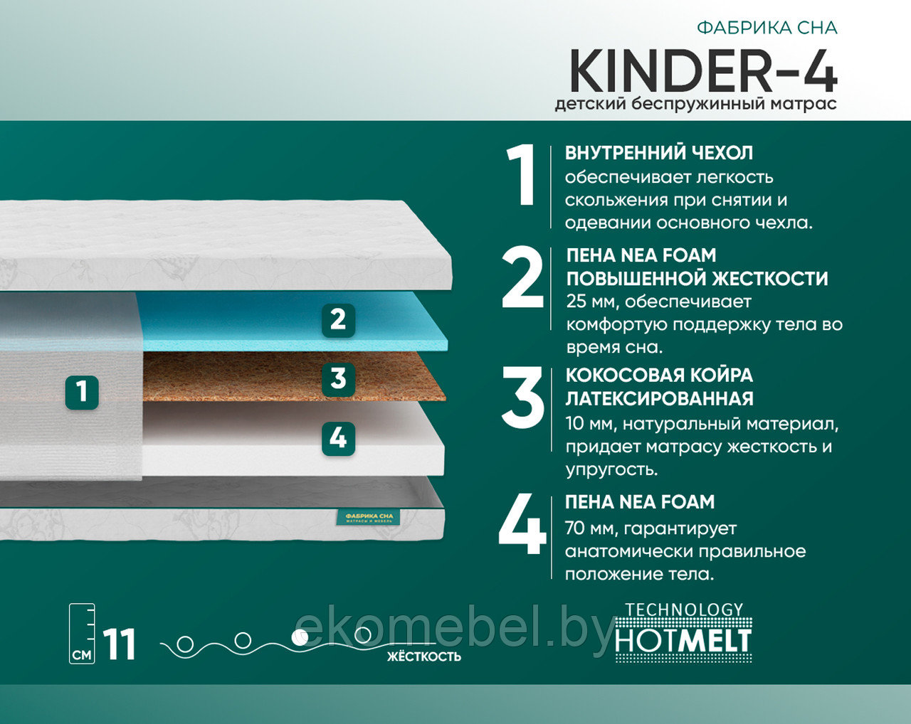 Беспружинный матрас "Киндер 4" высотой 11 см состоит из следующих материалов: