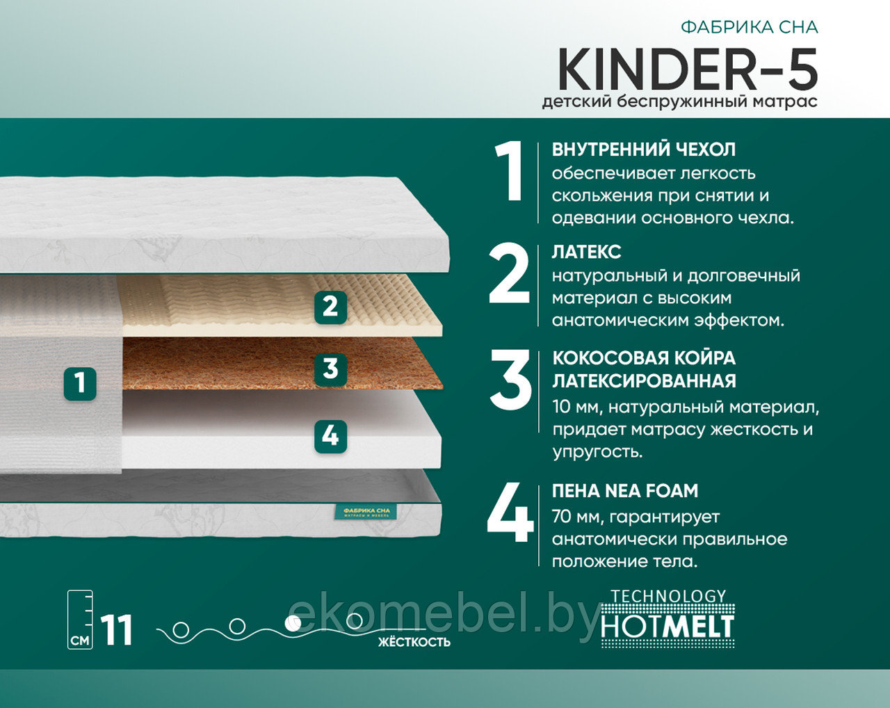 Беспружинный матрас "Киндер 5" высотой 11 см состоит из следующих материалов: