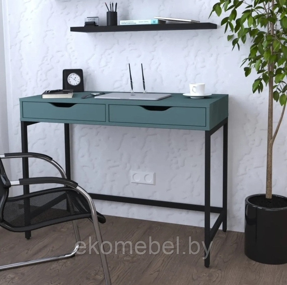 Письменный стол "Ингар" в серо-бирюзовом цвете идеально впишется в интерьер детской комнаты. На просторной столешницы можно разместить не только школьные принадлежности, но и компьютер или ноутбук. В столе предусмотрены две выдвижные полки для канцелярских принадлежностей, а также полка-тайник для проводов